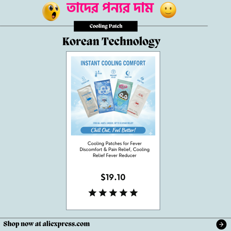আপনার জ্বর, মাইগ্রেন এবং স্ট্রেস কমানোর জন্য উপযুক্ত সমাধান হল আমাদের 12 Piece Ultimate Cooling Patch Set। চিকিৎসকরা বলেন, এই মেডিকেল গ্রেড কুলিং প্যাচটি জ্বর কমানোর জন্য সুরক্ষিত ও কার্যকর একটি পদ্ধতি। এটি বিদ্যমান ওষুধের মতো কোনো পার্শ্বপ্রতিক্রিয়া নেই, তাই শিশুদের জন্যও এটি নিরাপদ। জ্বরের তাপমাত্রা নিয়ন্ত্রণে সাহায্য করে এবং প্যারাসিটামল নেওয়ার আগে ব্যবহার করা যেতে পারে। এই প্যাচটি চুলকে ক্ষতি না করে নরম ও মসৃণ রাখে এবং কোরিয়ান পরিবারগুলো Emergency Fever Care হিসেবে সবসময় বাসায় রাখে। এটি হাইপোঅ্যালার্জেনিক, তাই সকল ত্বকের জন্য নিরাপদ। এখনই আমাদের Ultimate Cooling Patch Set সংগ্রহ করুন এবং সুস্থ থাকুন।