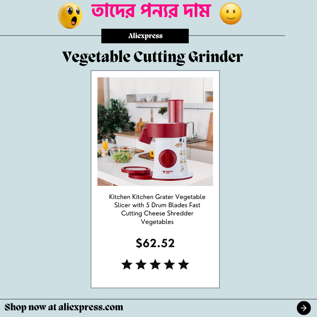 ✔️ এটি সবজি, ফল, সালাদ, পেঁয়াজ, আলু, গাজরসহ বিভিন্ন খাবার দ্রুত ও সমানভাবে কাটার জন্য ব্যবহার করা হয়।